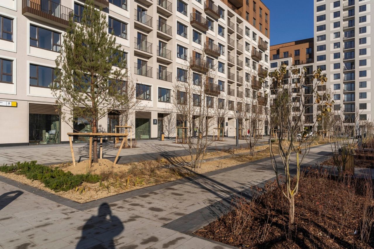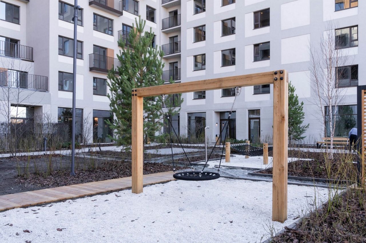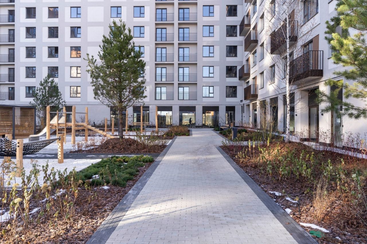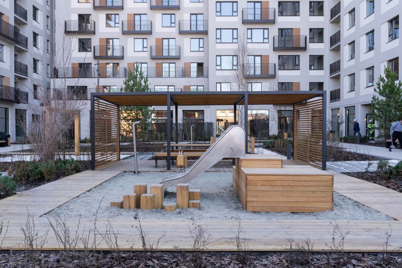 Двор свободен от машин. Здесь застройщик намерен 70% территории отдать под зеленые насаждения. Во дворе среди зелени разместятся лаунж-зоны с мягкой мебелью, детская площадка, теневые навесы, газон для игр и пикников, тренажёры для воркаута.